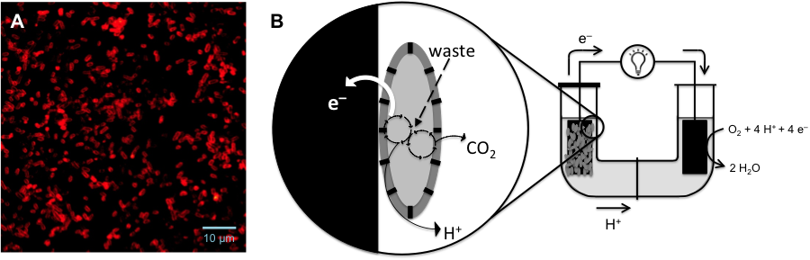 Figure 2 –(A) Confocal microscopy image of COE-stained E. coli. (B) Schematic representation of a microbial fuel cell employing molecular-wire-modified microbes for wastewater treatment and electrical power generation.